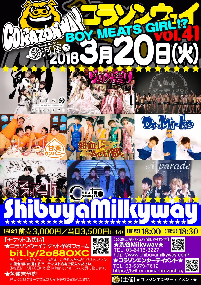 3月20日(火)『コラソンウェイvol.41 BOY MEATS GIRL!? Supported by 駿河屋』渋谷Milkywayにて開催。