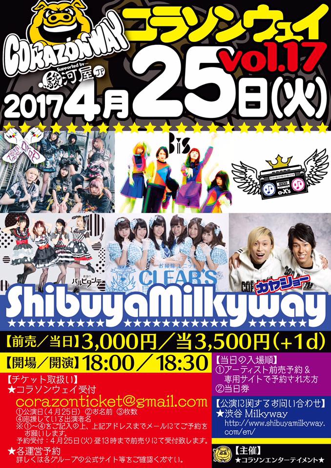4月25日に渋谷Milkywayでコラソンウェイvol.17開催!α-X’s(アクロス)の出演メンバーが発表されました。またタイムスケジュールは下記画像にてご確認ください。なお、物販は終演後に行われます。
